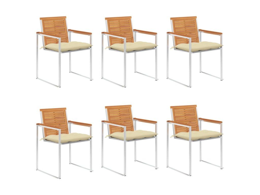 Jídelní židle jsou vyrobené z masivního akáciového dřeva a prvotřídní nerezové oceli. Proto mají dlouhou životnost, jsou odolné vůči rzi, robustní a snadno se čistí vlhkým hadříkem. Podušky, jež jsou více než jen praktický doplněk, mají také dekorativní funkci. Usaďte se k chutné večeři na zahradě nebo odpočívejte a užívejte si počasí s touto sadou klasických zahradních židlí.