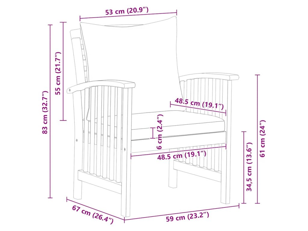Zahradní křeslo je vyrobené z masivního akáciového dřeva s olejovým povrchem, je stabilní a má dlouhou životnost. Řemeslné zpracování a krásná kresba dřeva dává každému kusu nábytku jeho charakteristický a neopakovatelný vzhled. Podušky na sedáku a polštář za záda přispívá k pohodlnému posezení.