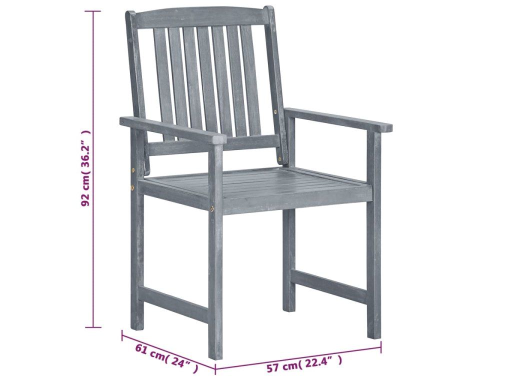 Zahradní židle jsou vyrobené z masivní akácie s povrchem zesvětleným do šeda. Jedná se o tvrdé dřevo s hustou kresbou. Masivní akáciové dřevo se vyznačuje schopností unést i velkou váhu a zároveň skvěle odolává opotřebení a působení času. Sada dřevěných židlí je stabilní, hodně toho vydrží a nepodléhá klimatickým vlivům. Jejich povrch se navíc snadno čistí navlhčeným hadříkem. Přiložené podušky vám zajistí maximální pohodlí.