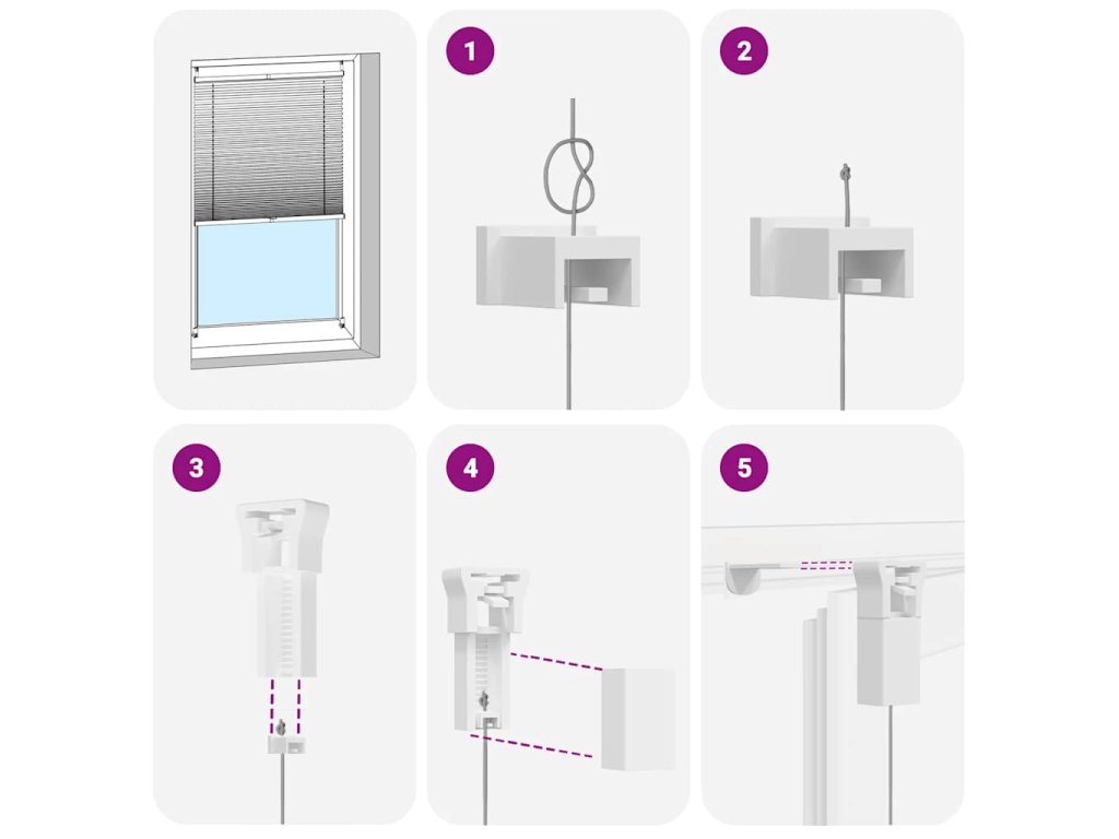 Tyto plisované žaluzie se namontují pomocí upínacího držáku, bez vrtání do zdí, oken nebo dveří. Jsou velmi vhodné pro použití v obývacích pokojích, ložnicích, koupelnách, kuchyních, jídelnách, kancelářských budovách, zasedacích místnostech, pokojích pro hosty, atd.