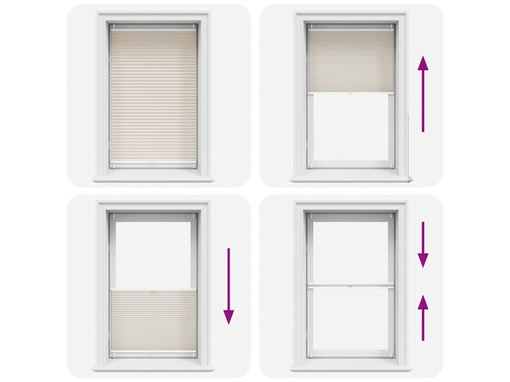 Tyto krémové plisované žaluzie jsou ideální pro zajištění soukromí a ochranu před sluncem. Lze s nimi pohybovat jak v horní, tak i v dolní části, dle vaší potřeby. Nastavením do různých poloh dosáhnete zajímavých efektů.