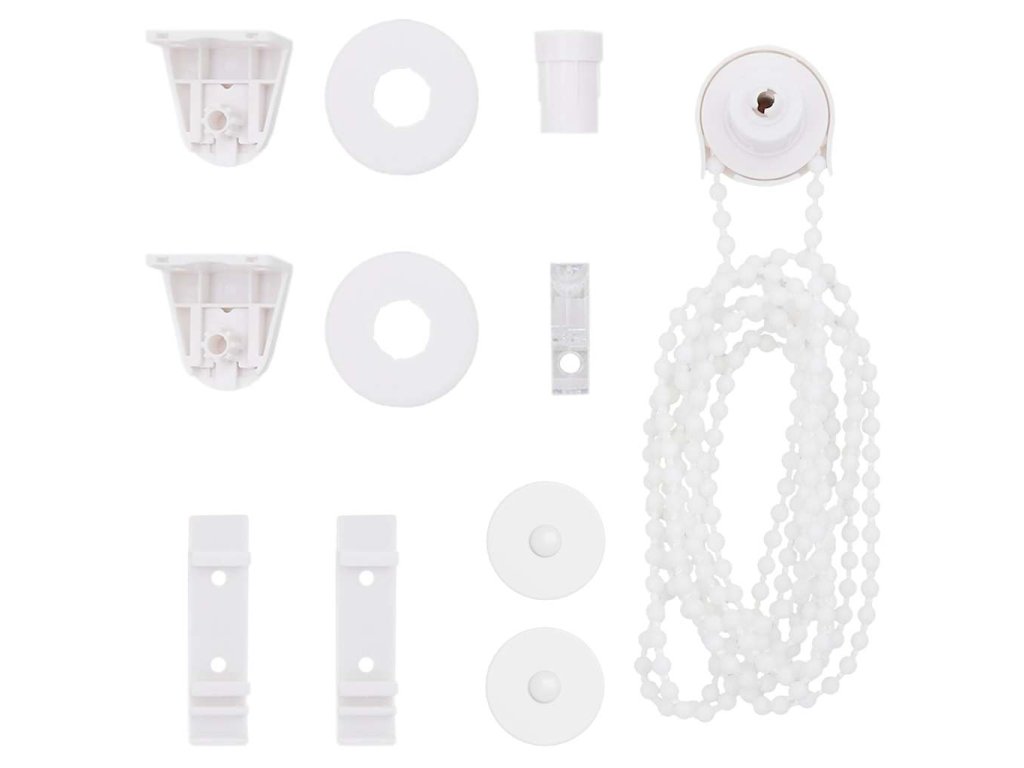 Dodávka obsahuje 1 x 80 cm horní hliníkovou lištu s látkou se zebrovým potiskem 77 x 175 cm, 1 x 80 cm horní lištu, 1 x 80 cm silnou spodní lištu, 2 x hák na závěs, 2 x konzolu, 1 x držák řetízku, 2 x těsnění a 1 x kuličkový řetízek.
