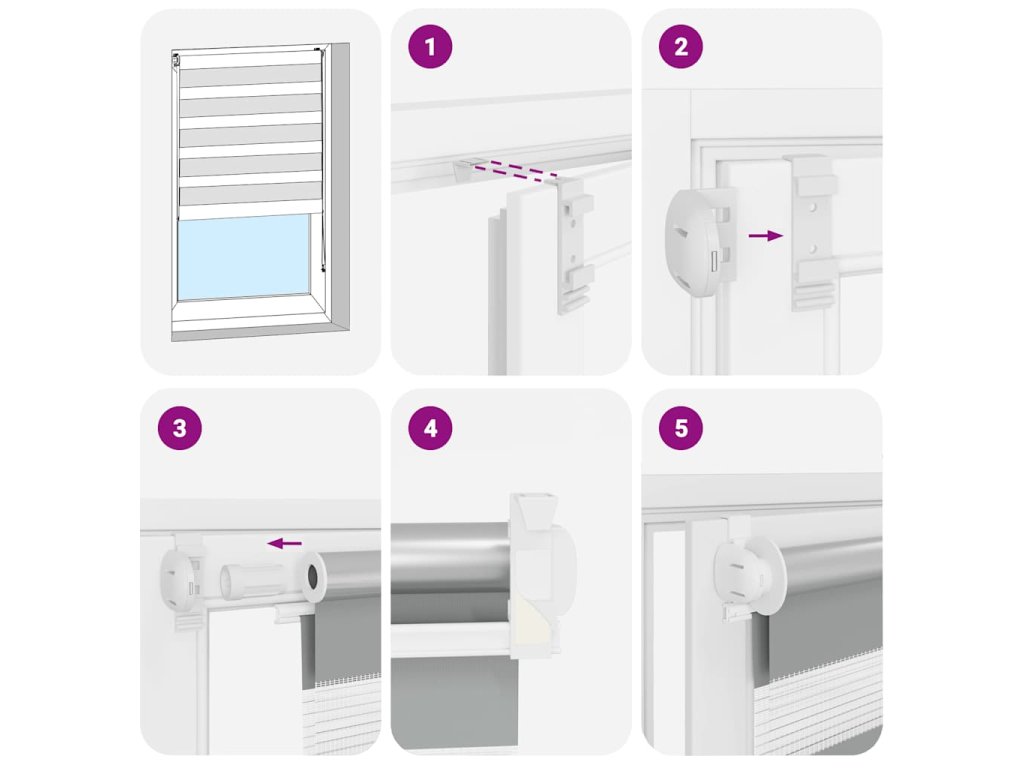 Dodávka obsahuje 1 x 90 cm horní hliníkovou lištu s látkou s potiskem zebry 87 x 150 cm, 1 x 90 cm horní lištu, 1 x 90 cm silnou spodní lištu, 2 x hák na závěs, 2 x konzolu, 1 x držák řetízku, 2 x těsnění a 1 x kuličkový řetízek.