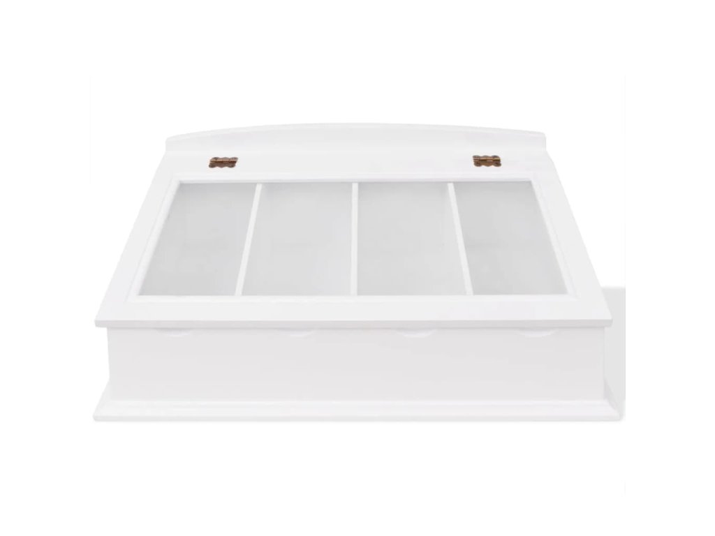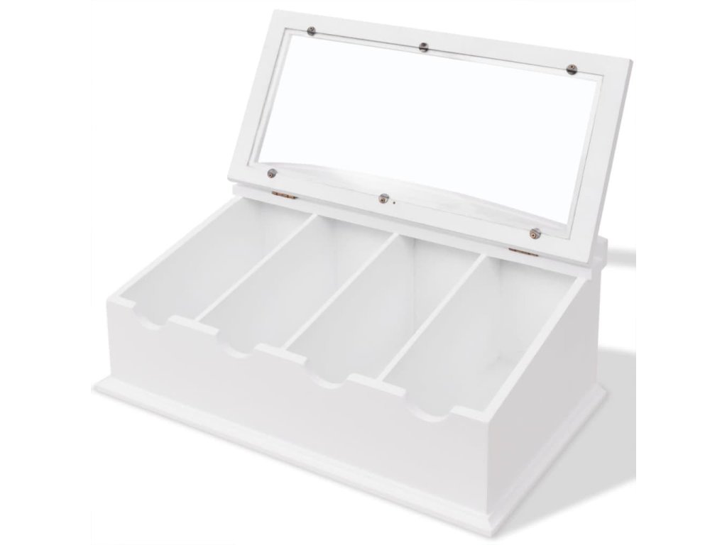 Tento zásobník na příbory má 4 velké a hluboké přihrádky, které poskytují dostatek úložného prostoru. Je opatřen skleněným víkem, které chrání předměty uvnitř před prachem, a zároveň vám umožní mít přehled o vaší sadě příborů a rychle se dostat k uloženým předmětům, které potřebujete. Tento zásobník na příbory je vyroben z vysoce kvalitního MDF, takže je velmi odolný.